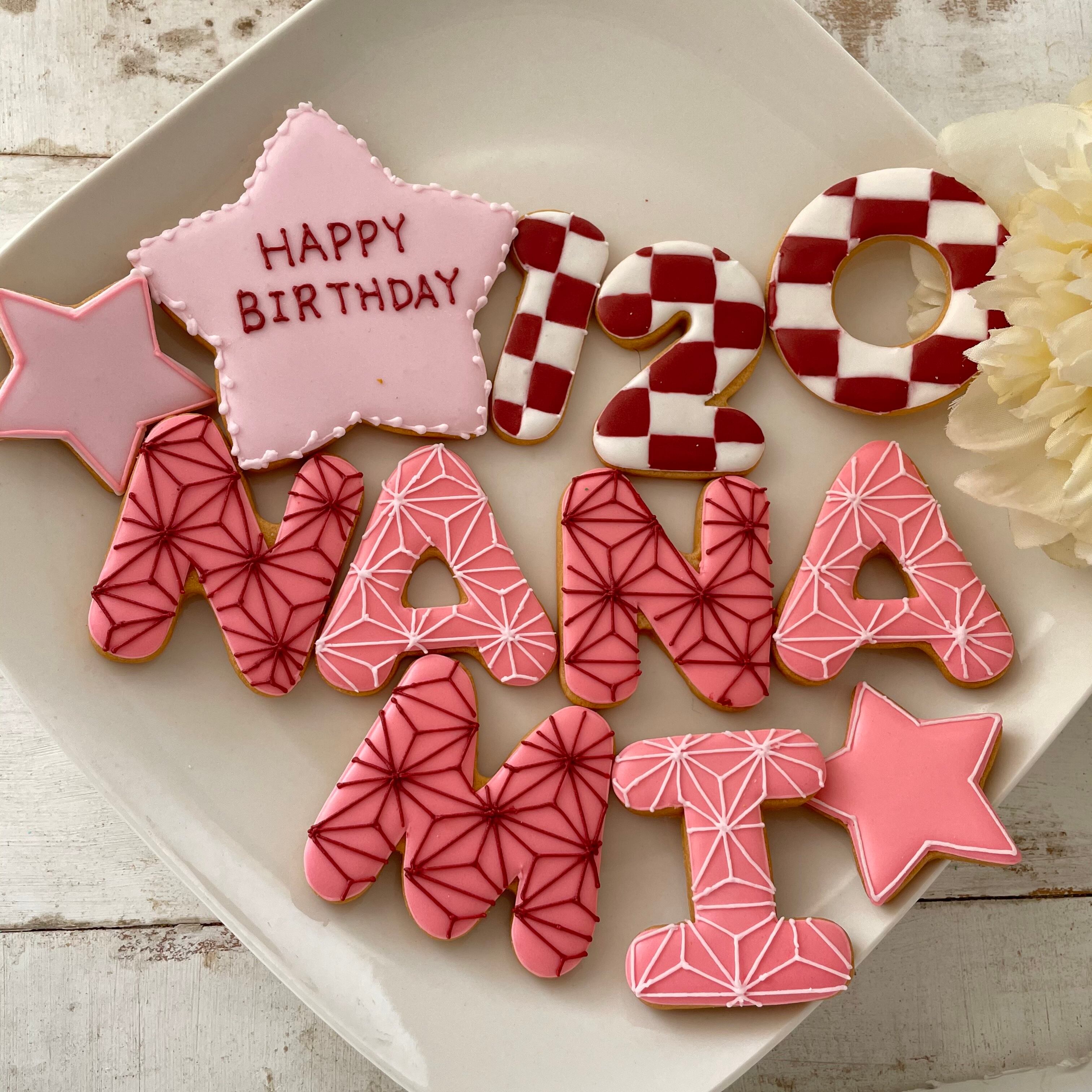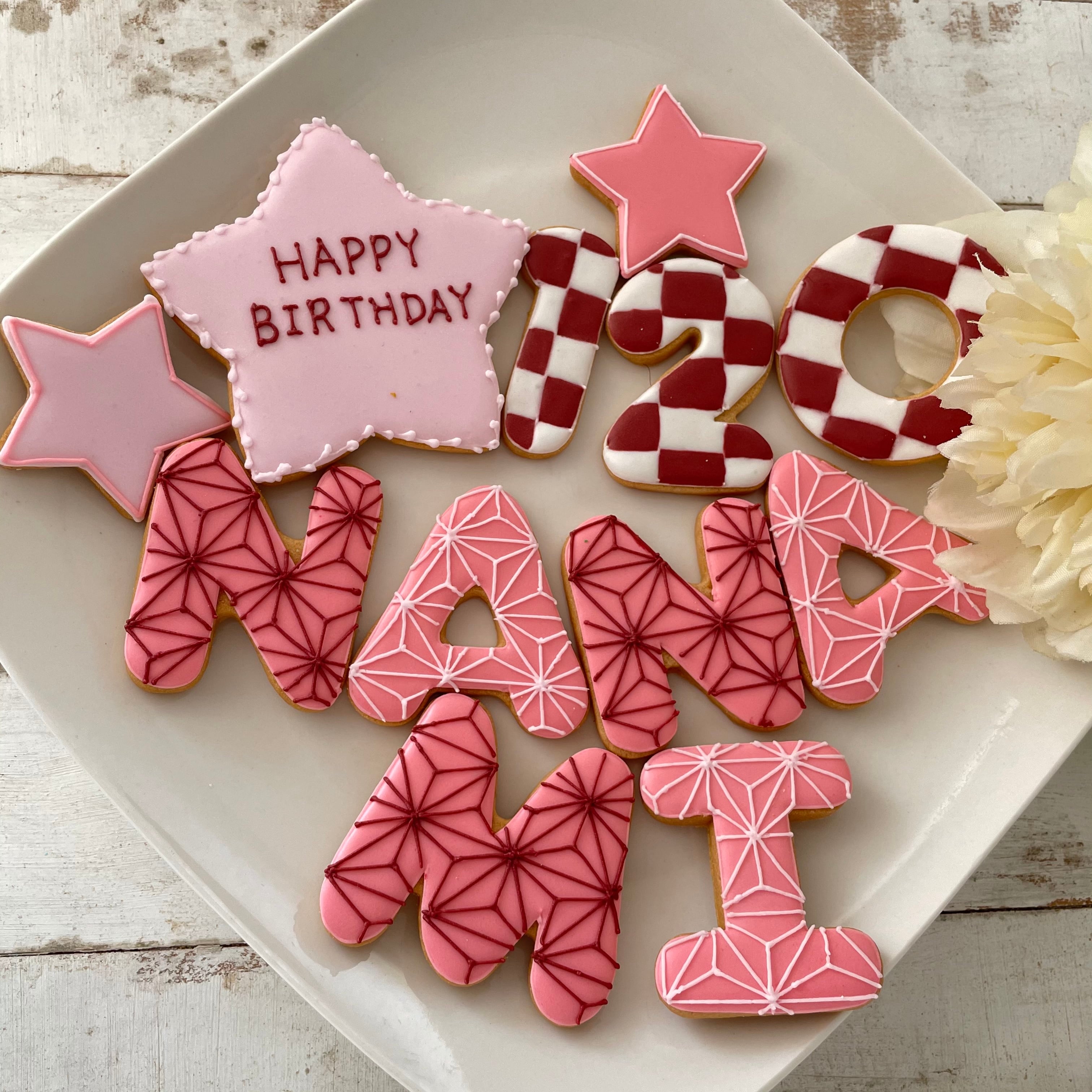 セミオーダーバースデーのアイシングクッキーセット(ピンク系和柄)です。
