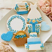 誕生日らしいプレゼント、ケーキ、花束のアイシングクッキーをセットにしました。